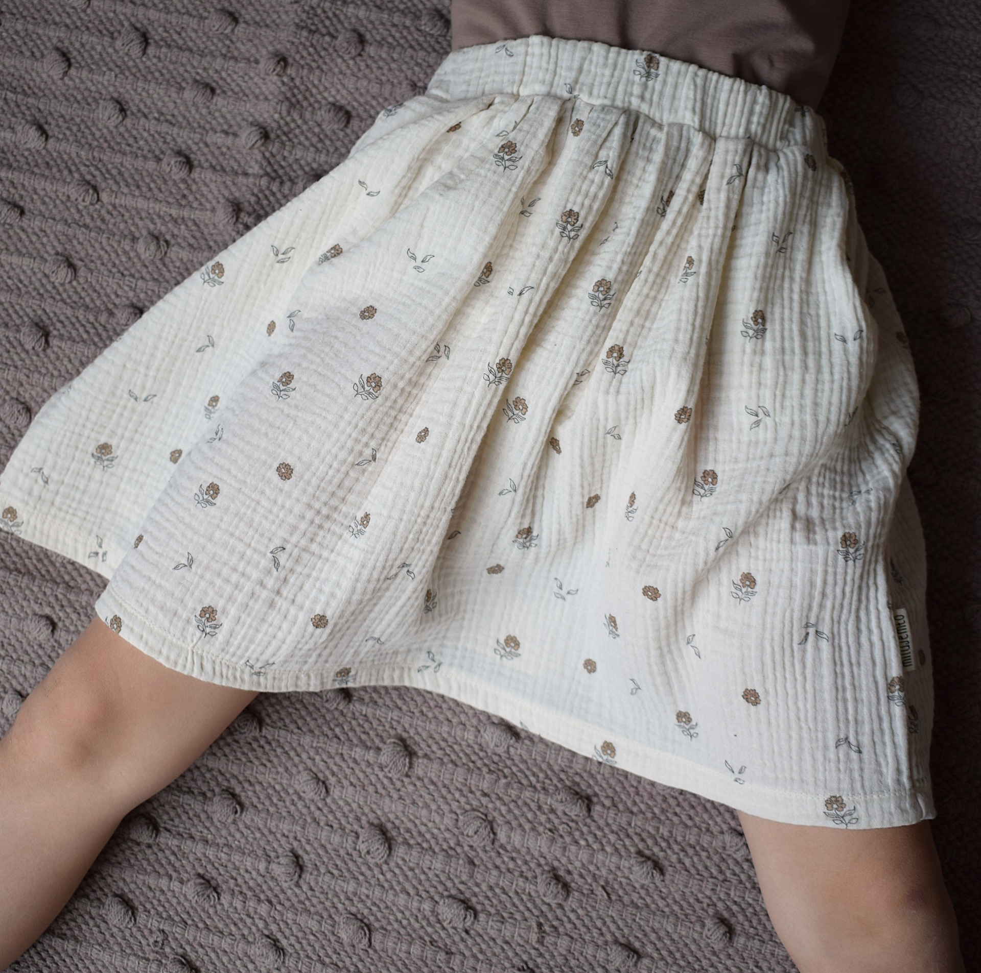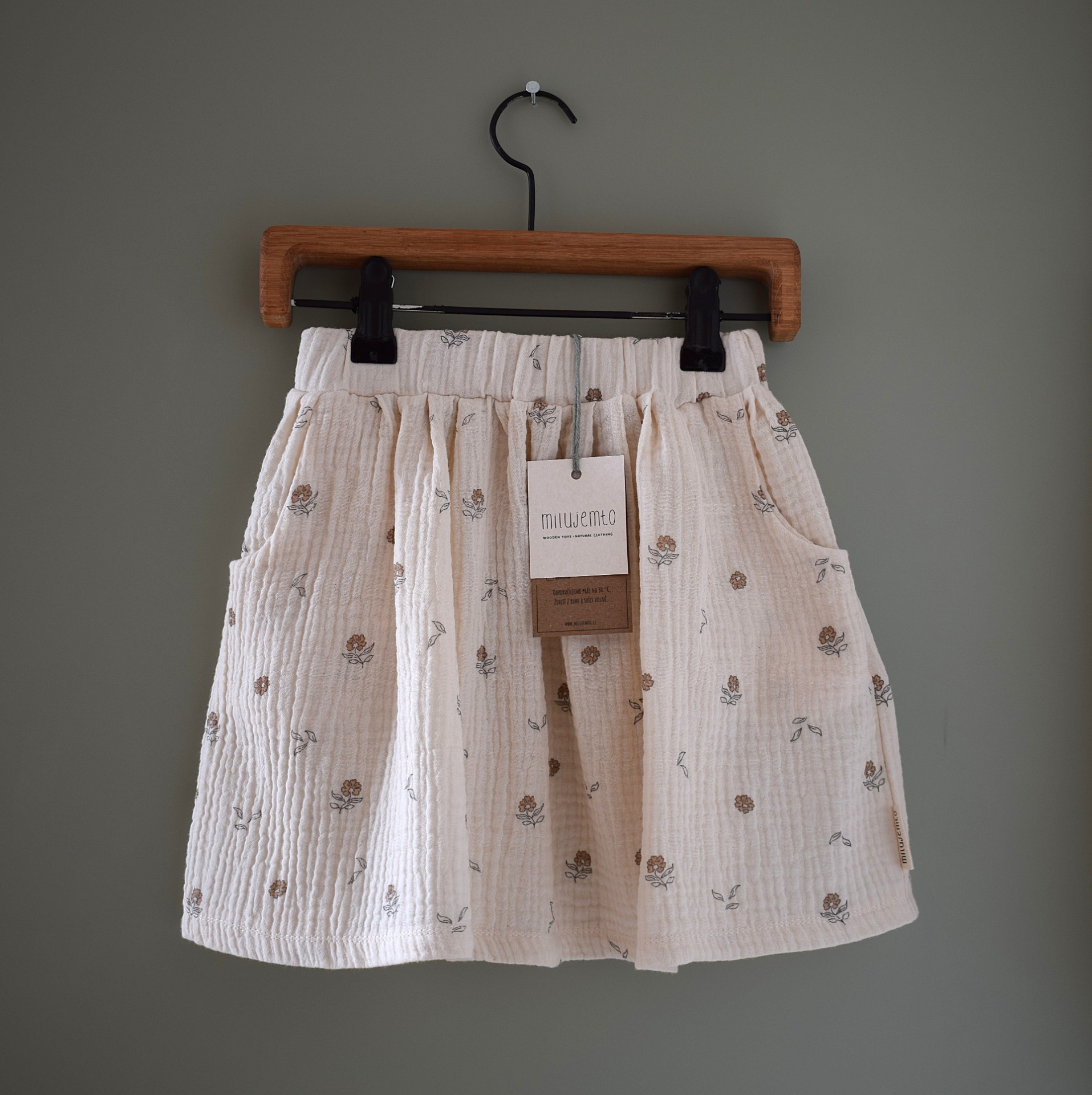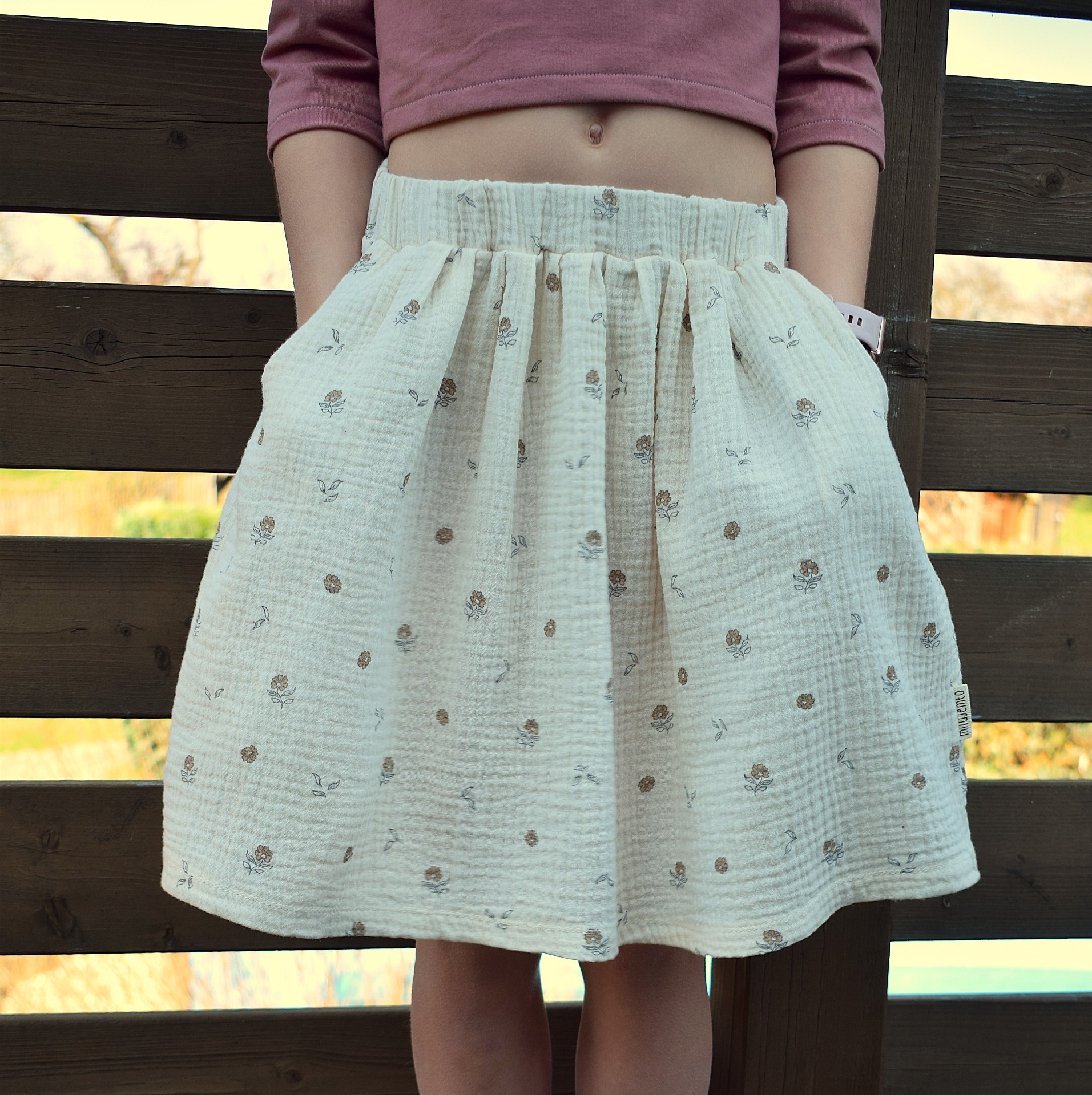 Květinová sukně z mušelínu v biokvalitě. V pase má gumu a nechybí jí kapsy na všechny důležité drobnosti.