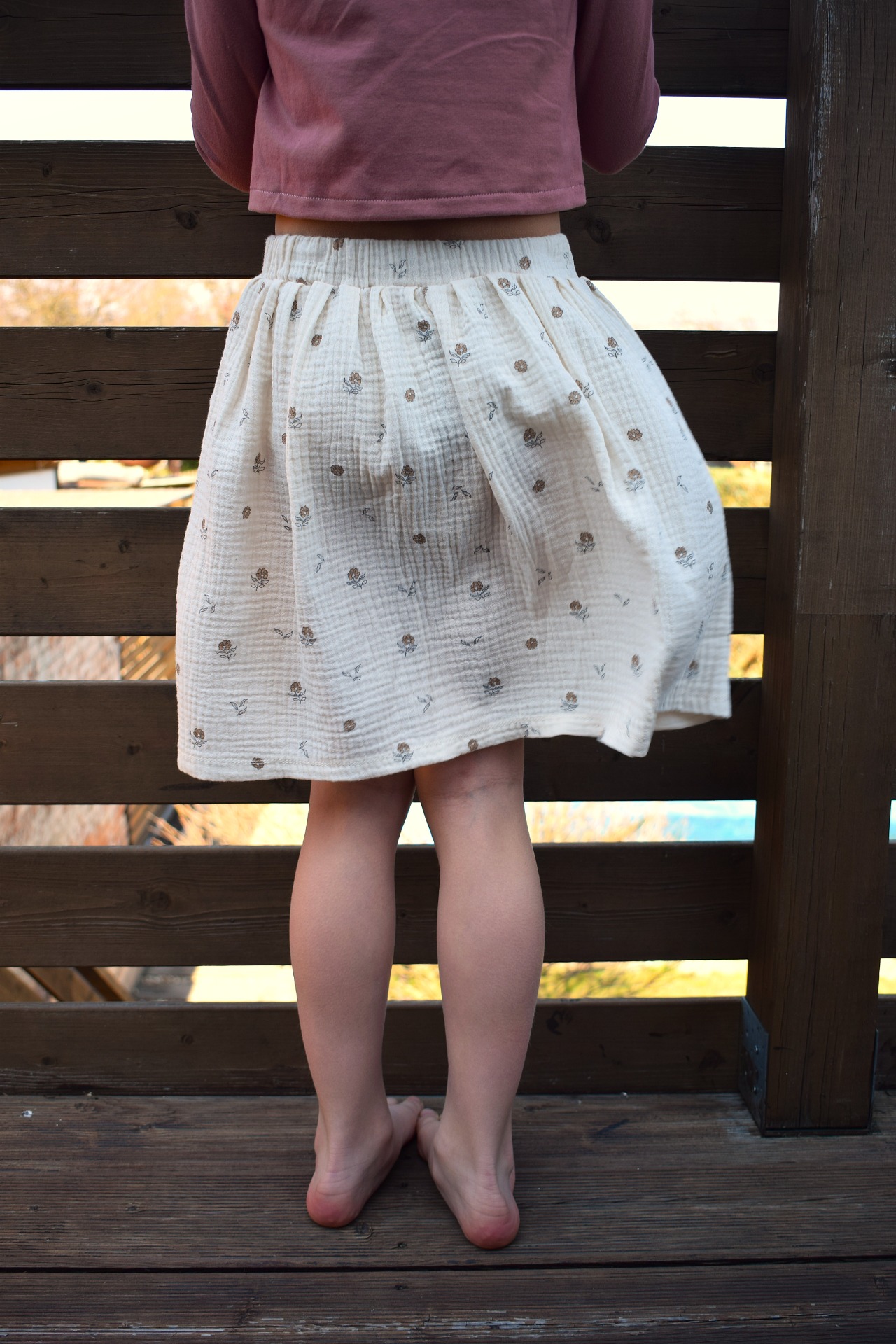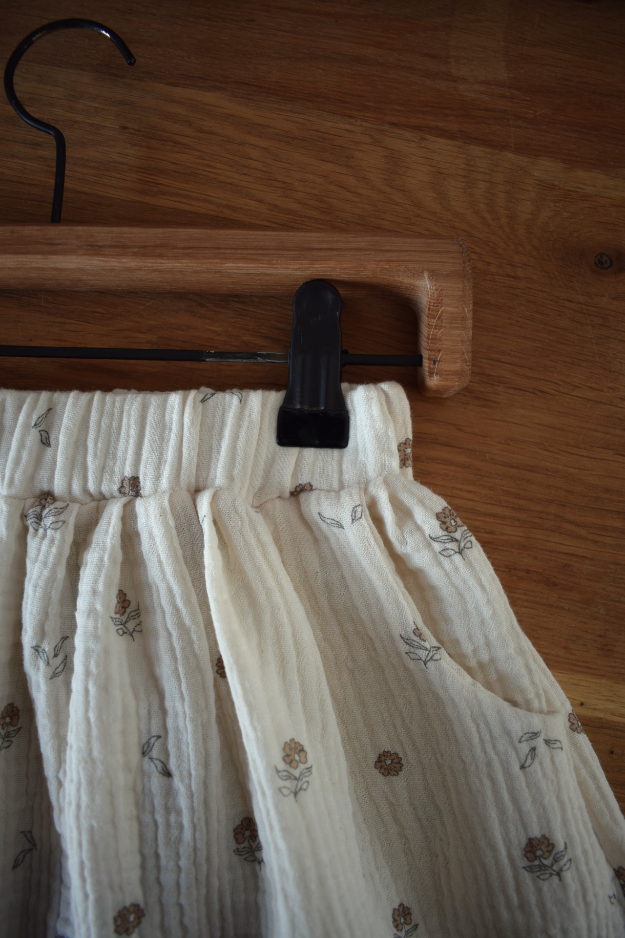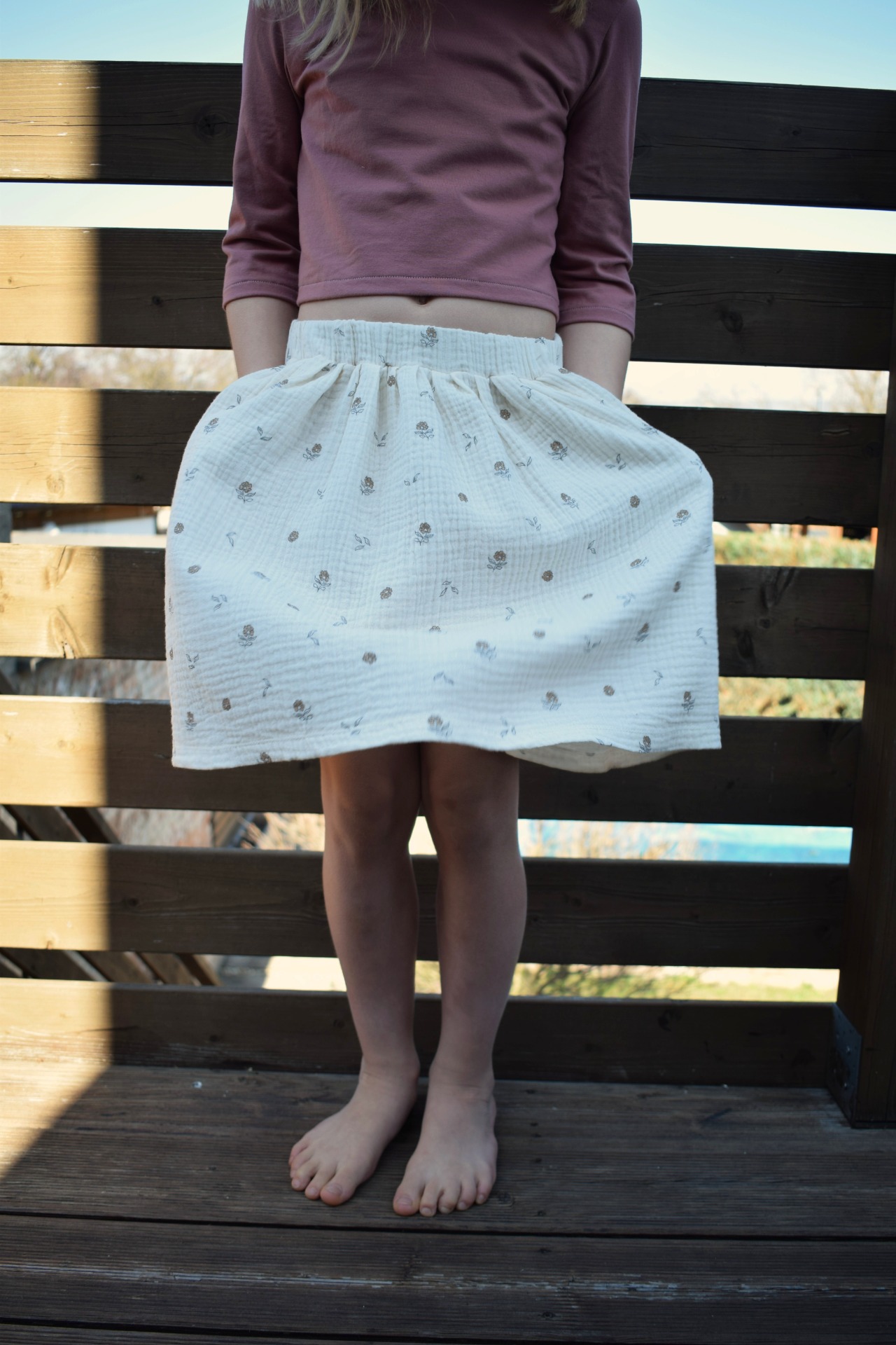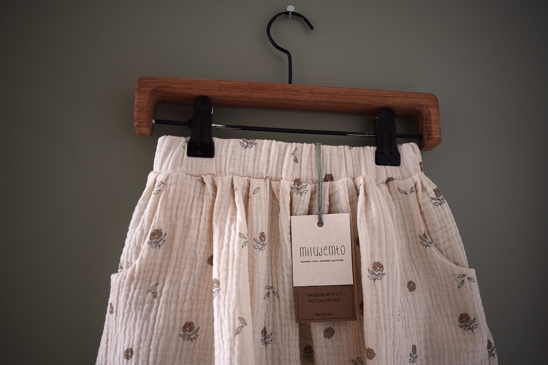 Květinová sukně z mušelínu v biokvalitě. V pase má gumu a nechybí jí kapsy na všechny důležité drobnosti.