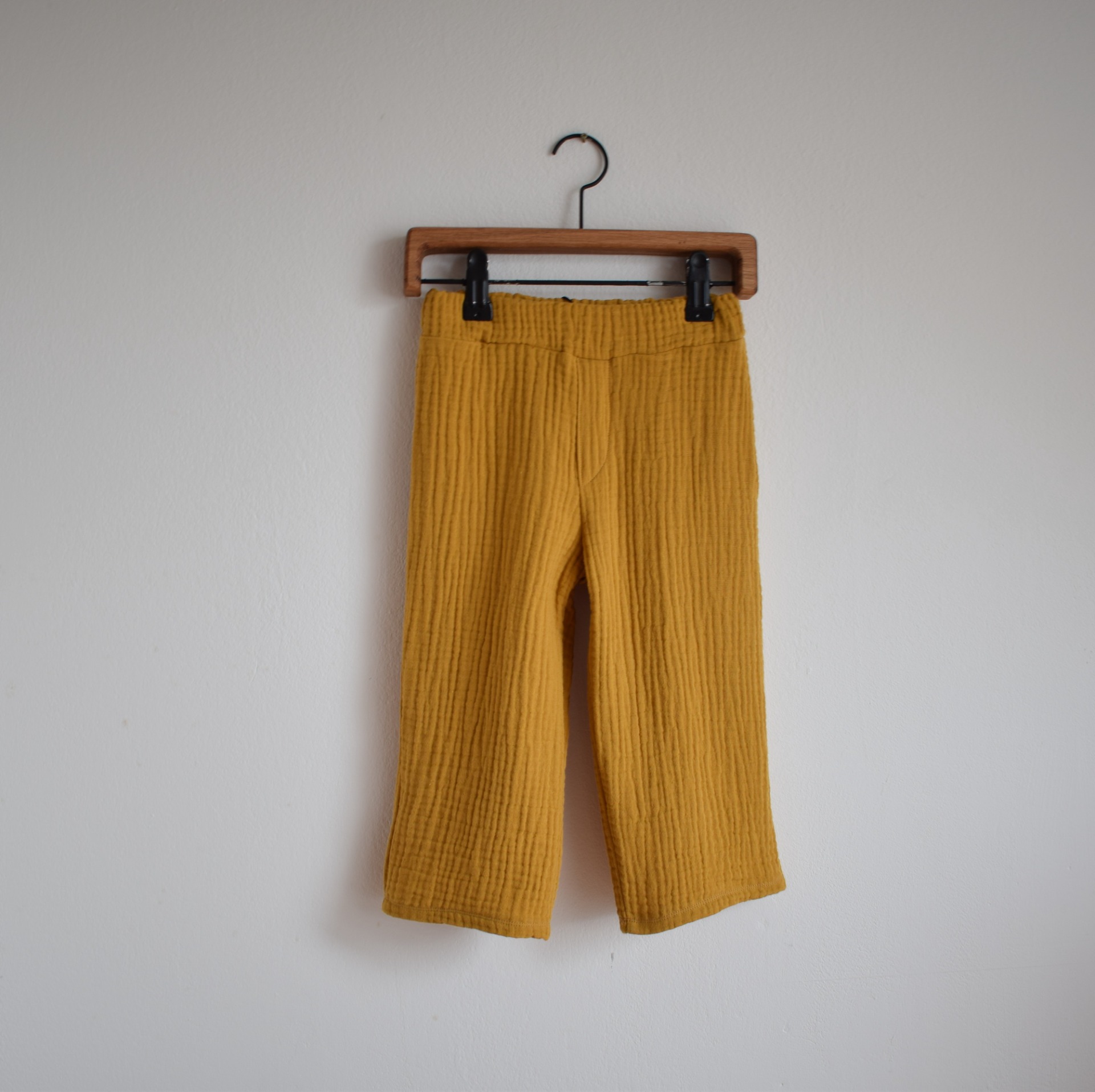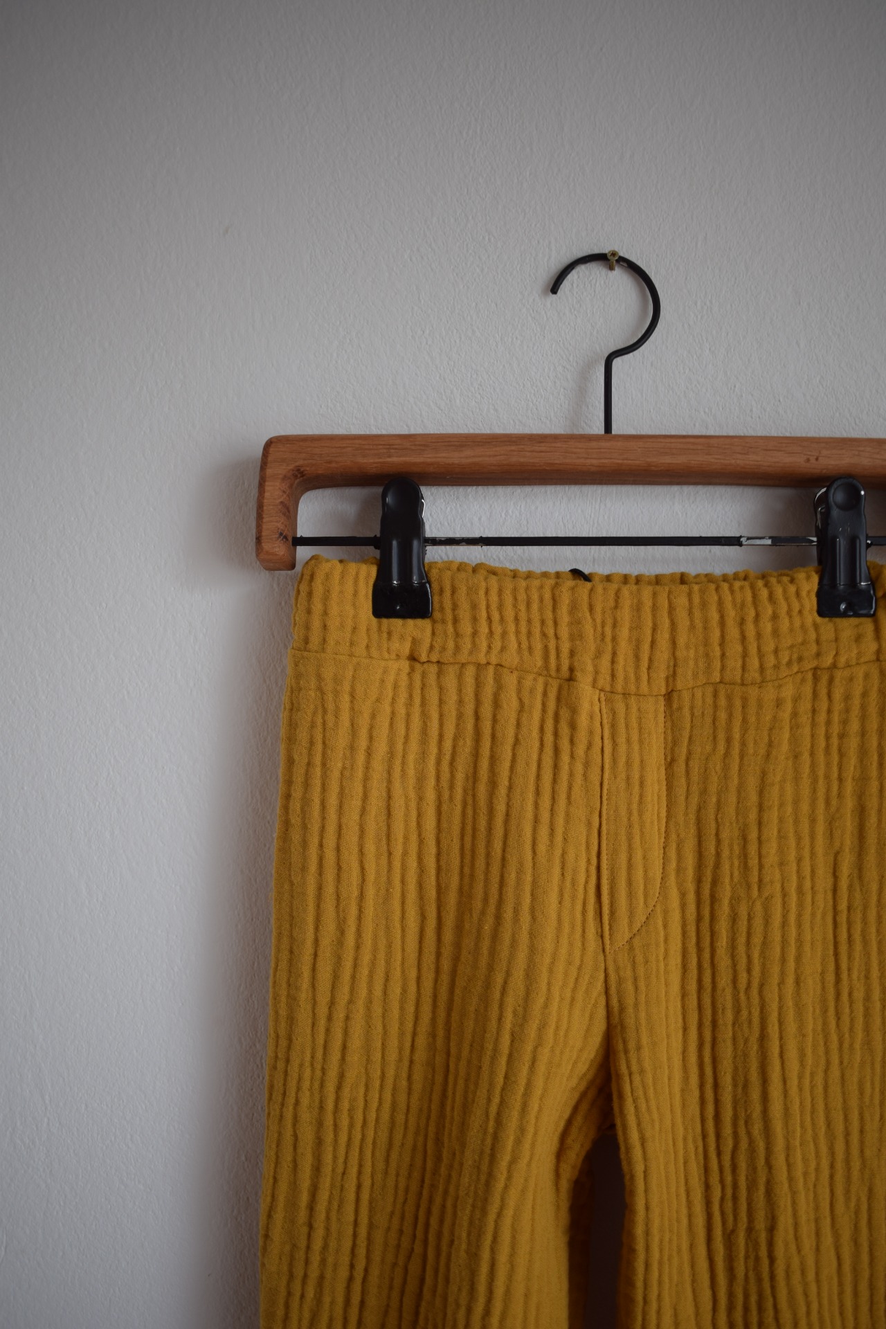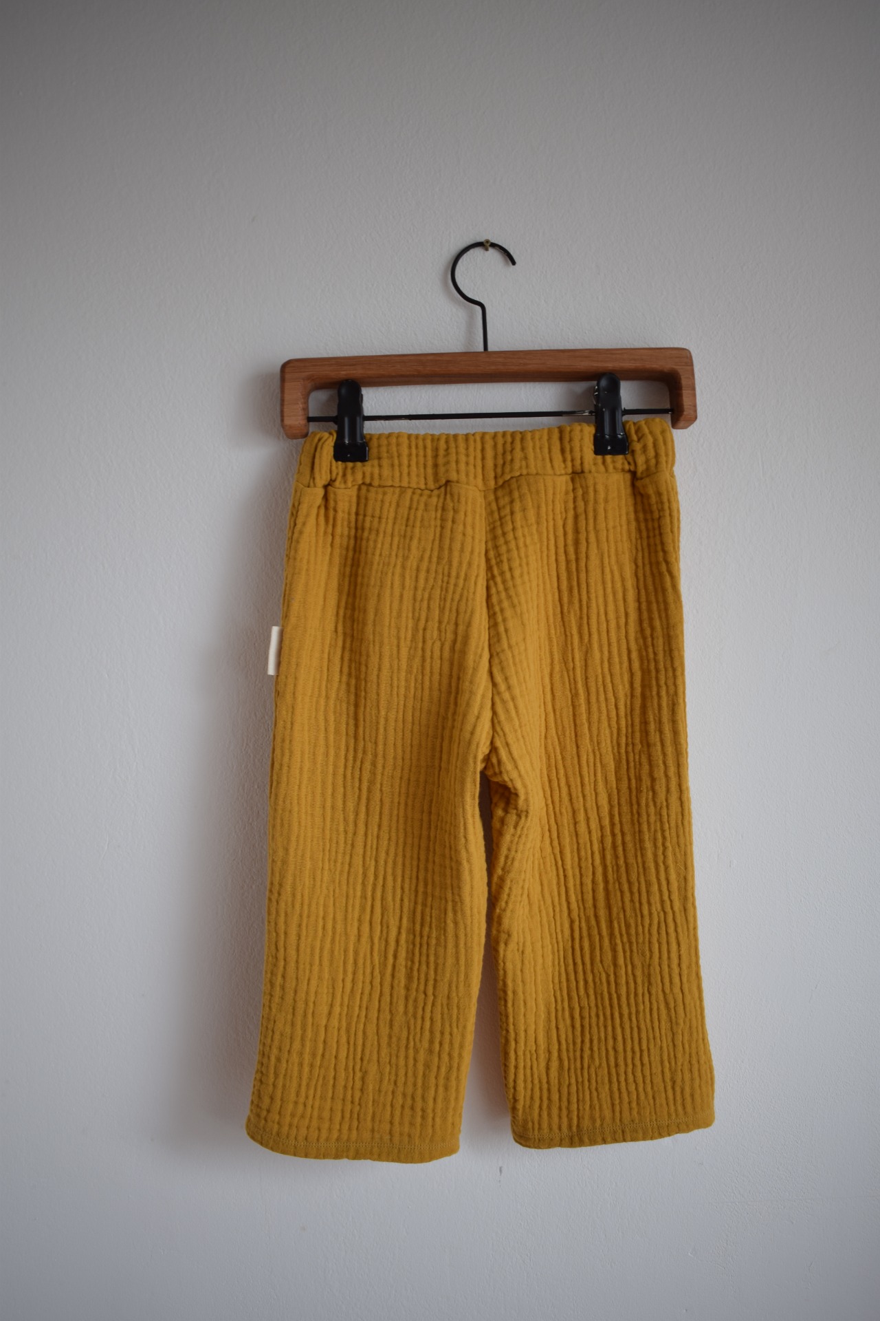 Jarní/letní kalhoty v hořčicové barvě ušité ze silnějšího bio mušelínu. Volnější střih nechává dostatek prostoru pro pohyb. V pase guma aby nic netlačilo. Na zahradu, do města i na doma.